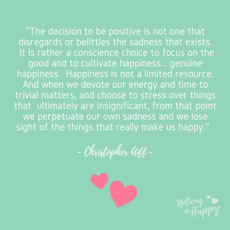 I think there is a lot to be said about the power of choice, the power to choose. We get to choose our thoughts- if a negative thought comes into our mind, we get to choose to agree with it or redirect it and remind ourselves of something more positive. In the quote above, Christopher Aiff says that positivity is simply a “conscious choice to focus on the good and cultivate happiness.” It doesn’t discount sadness or “belittle the sadness that exists” but reminds us that we have the power to CHOOSE. Especially in the standard day-to-day stressors, I think this is extremely important.