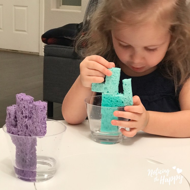 In the morning, the WHOLE cactus was wet! And the sponge stayed wet almost another day. Ava was mildly impressed… but I thought it was super cool! I think if we do this again when she’s older, she would appreciate it more. She really liked the first part (where you could watch the water climb up the sponge) but I don’t think she appreciated the fact that the sponge had absorbed everything by morning. To be fair, she is only two. I still loved it and would do it again, especially because it was so easy. We may use the sponges to do cactus painting later too – Ava loves painting.