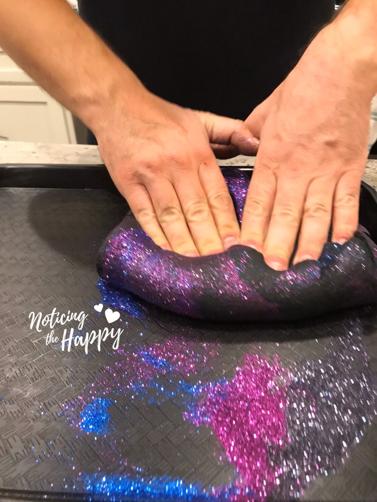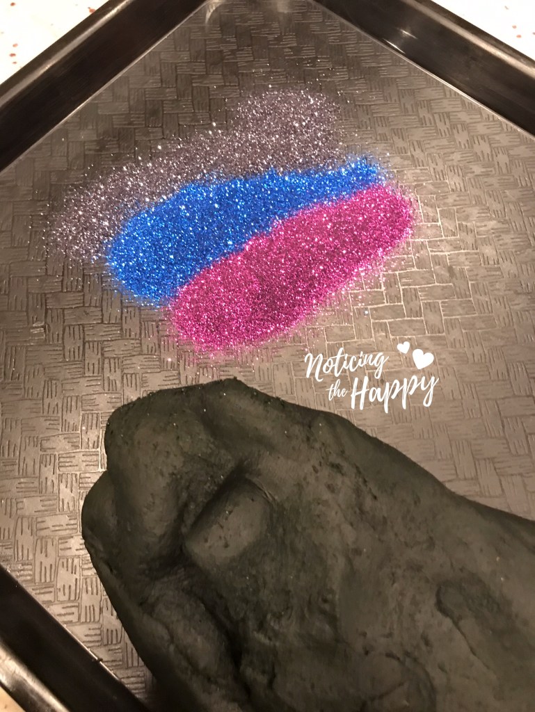 Next, on a plastic tray or wax paper, spread glitter on the flat surface, then place dough on top and knead the glitter into it. Add to desired sparkle-level.