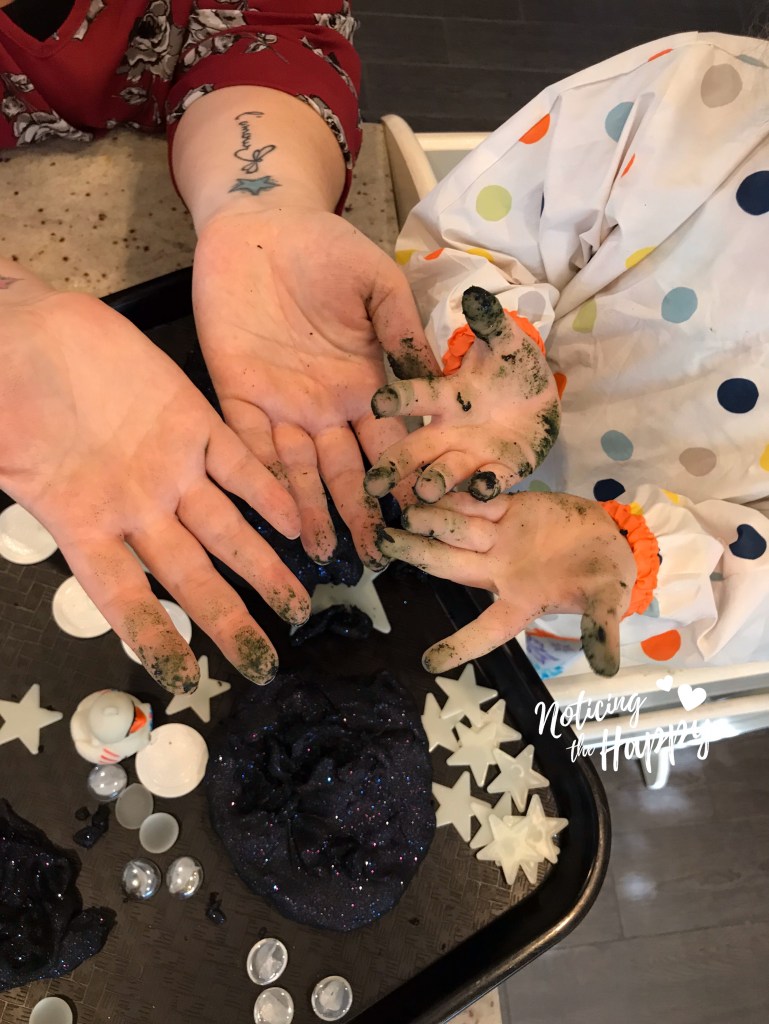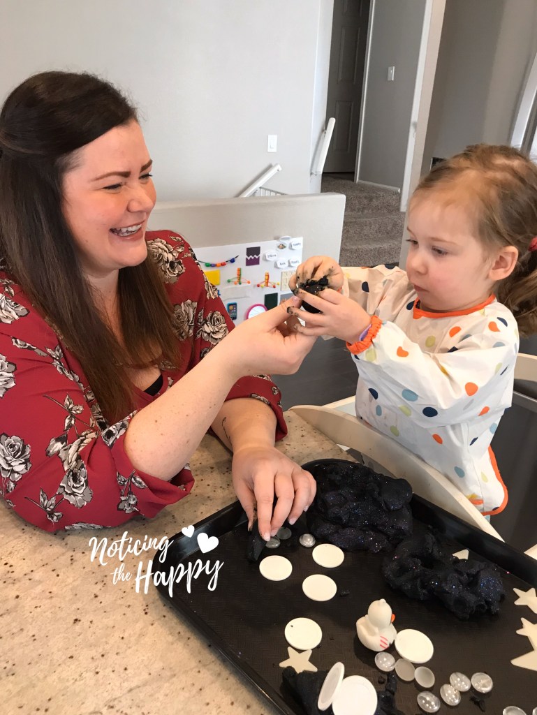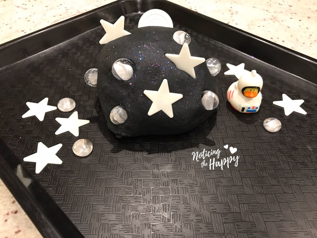 This playdough was one of my favorites – it’s vibrant and so sparkly! It’s fairly easy to make and lasted a SUPER long time. We added white poker chips, clear glass beads, and glow in the dark stars (plus one astronaut rubber duckie) to make the night sky. The dark dough did get stuck under our finger nails, but it was easy to clean up so that didn’t bother me much.